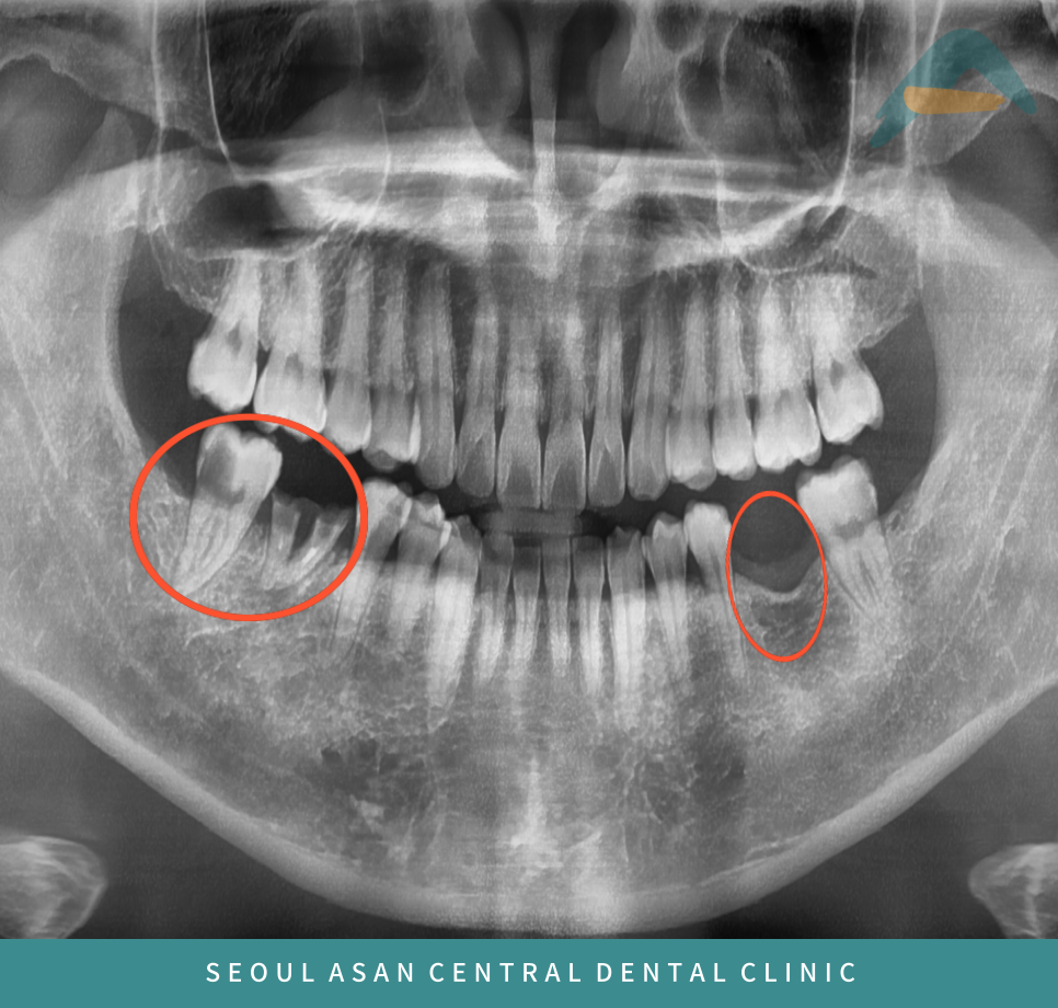 오른쪽 첫 번째와 두 번째 어금니는 발치 후